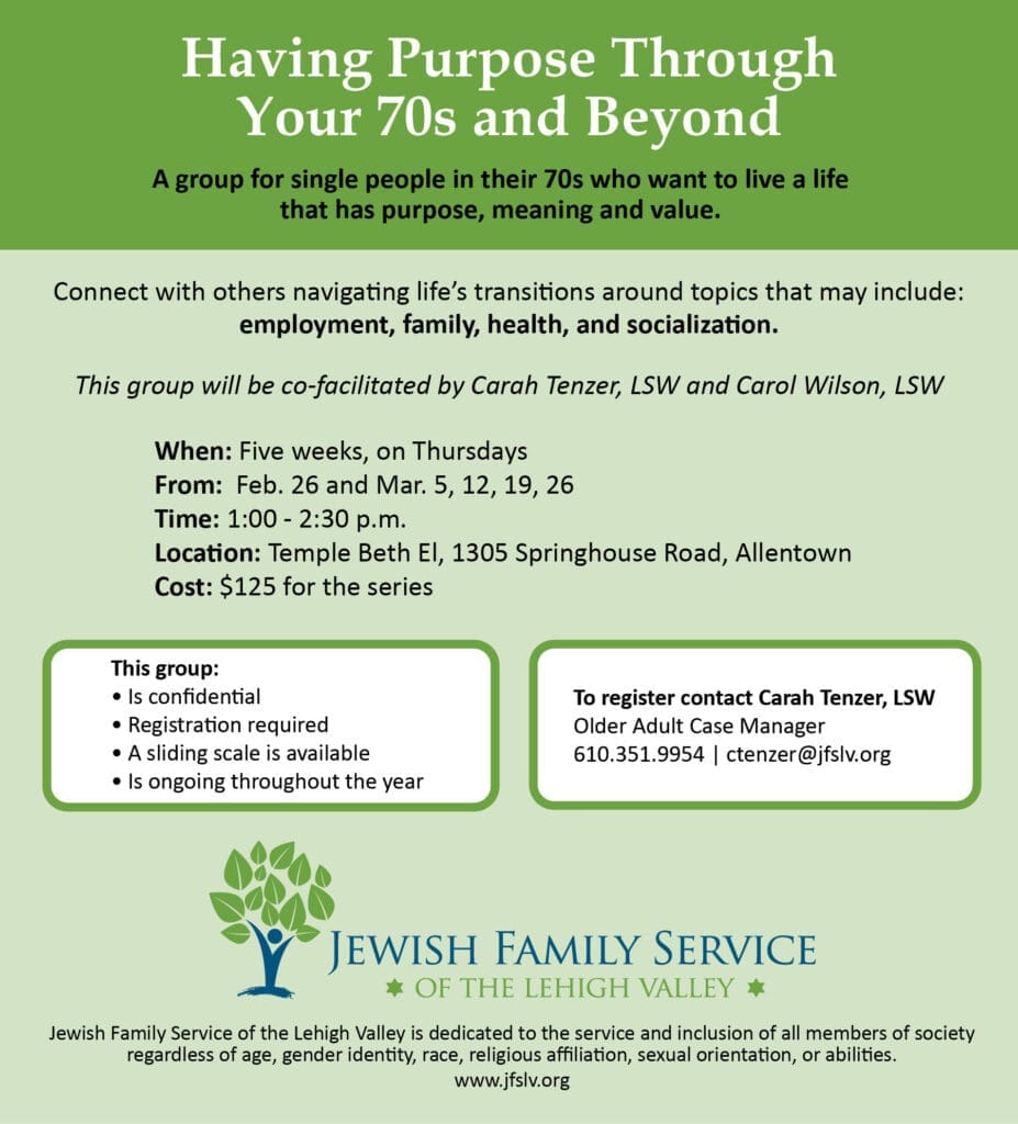 Jewish Family Service of the Lehigh Valley, guided by Jewish values, helps individuals and families to live healthier and more stable lives by providing social services, professional counseling, education and community programs.